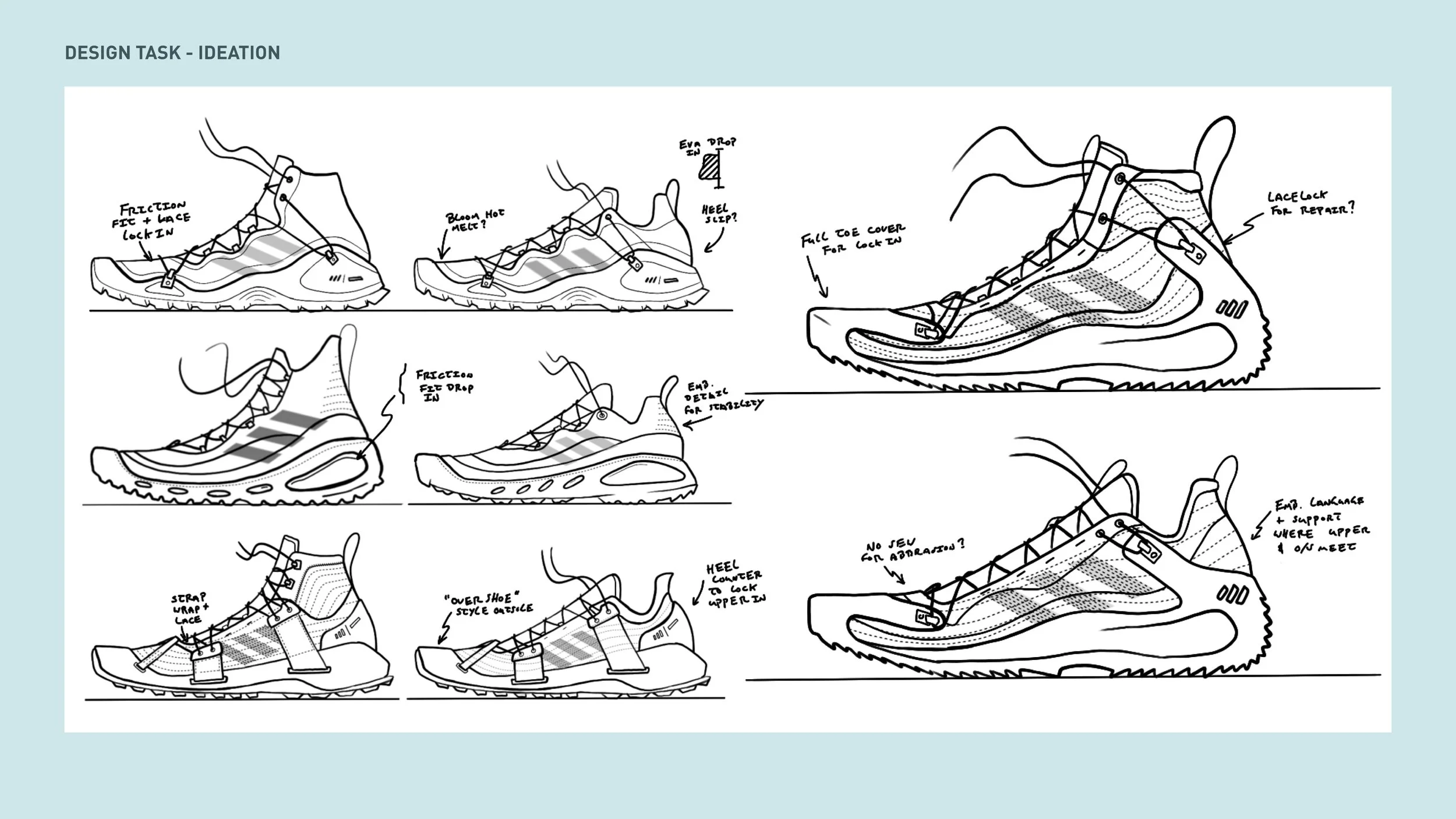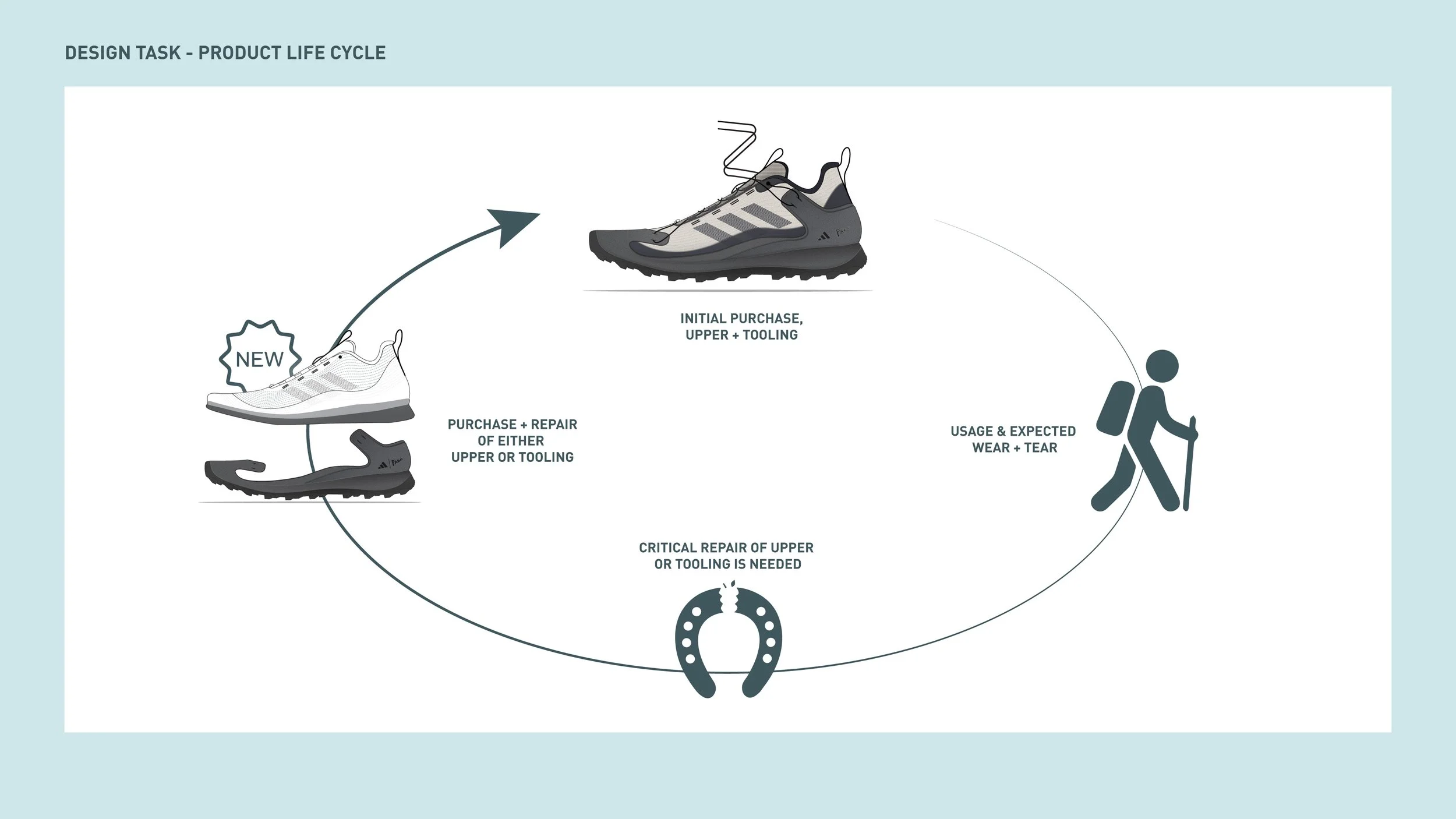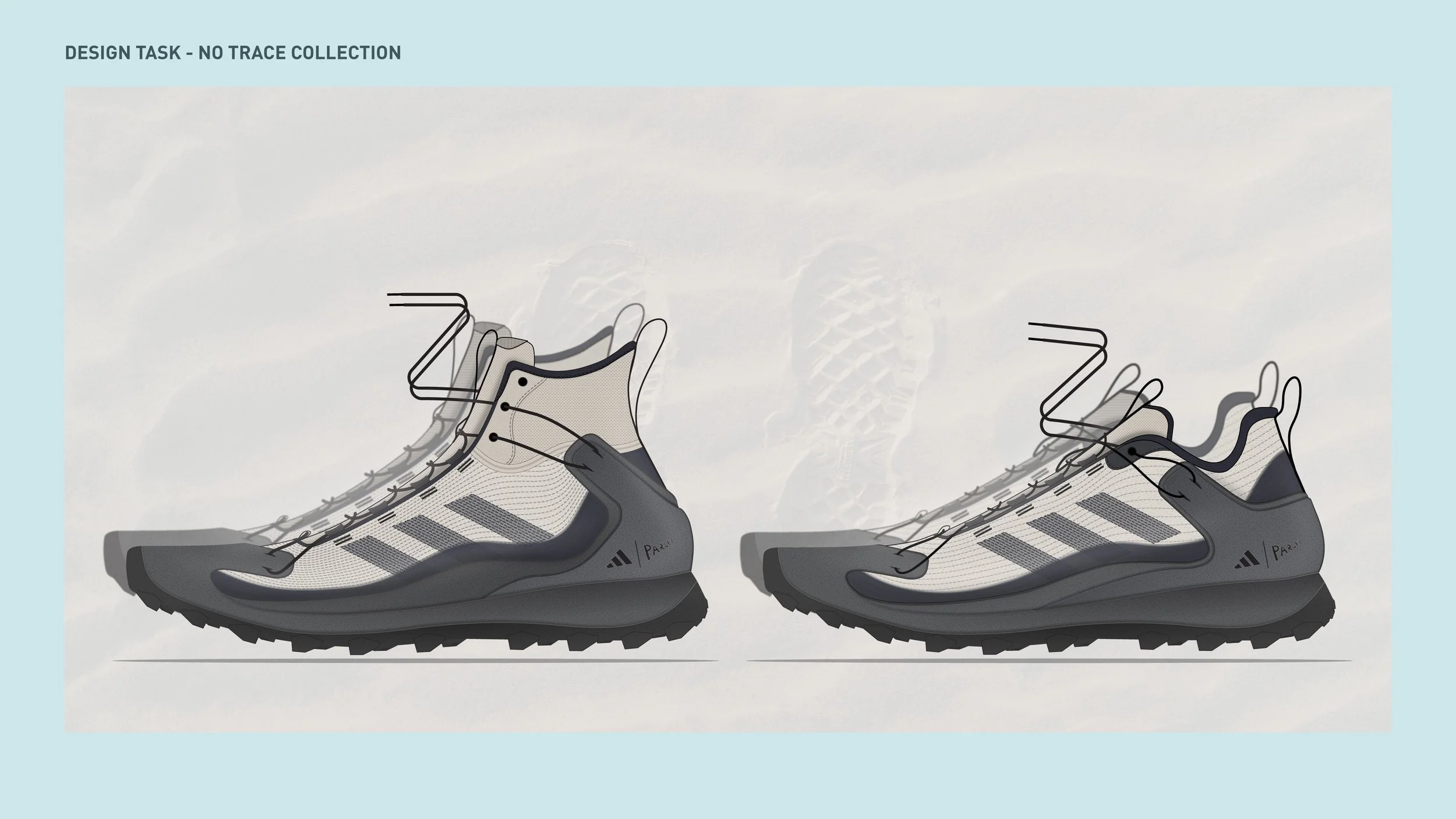 We would like to invite you to express your imagination of a new starting line for future outdoor footwear, that is carrying the PARLEY message and is helping adidas and Parley to express a true strong proposition along the line of sustainability and enhanced product quality.